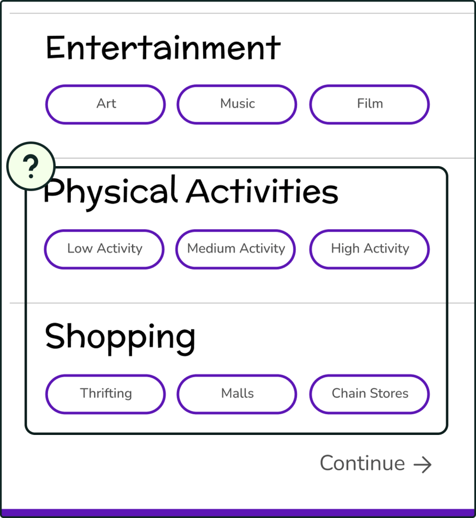 Because our scenario only involved going to one stop, users were confused about needing to enter preferences for other genres of outings. As a result, the process, which we intended to take around 15-30 seconds, ended up taking a bit longer.
