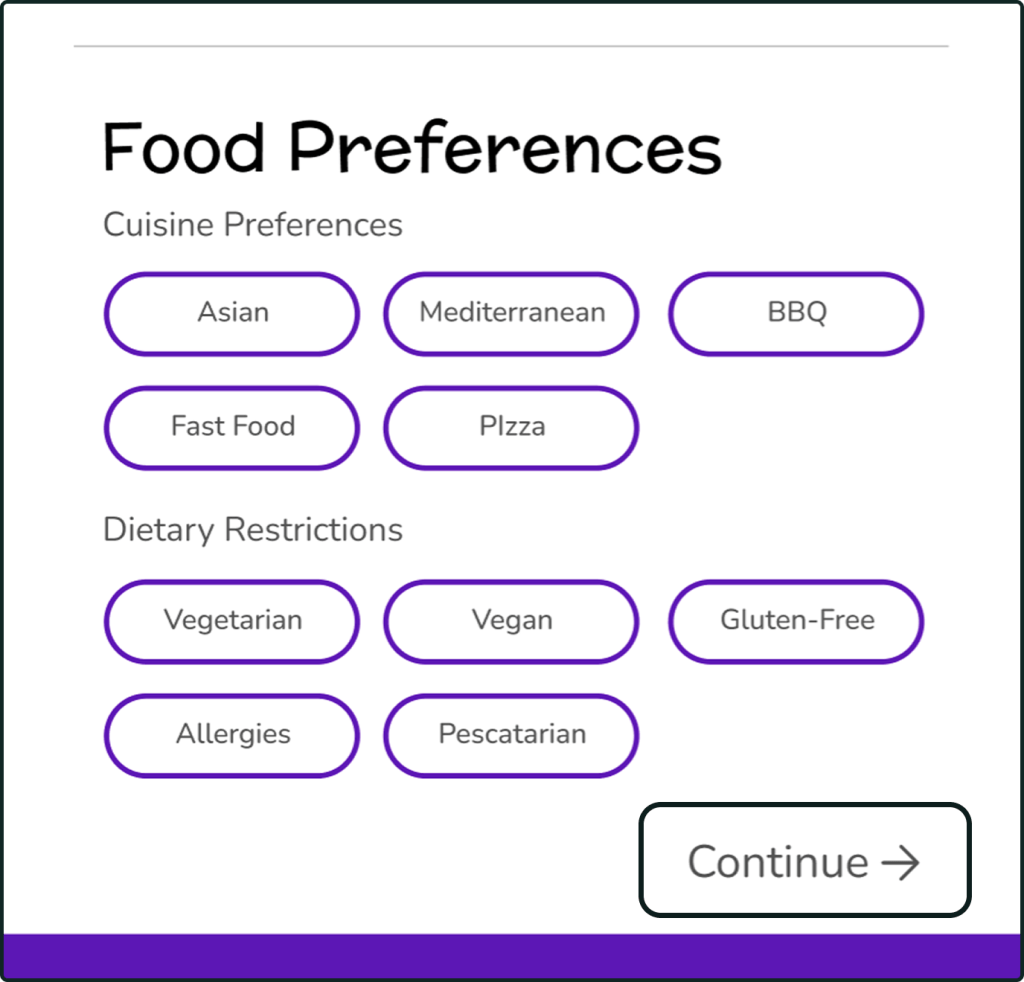 Preferences: The intake menu allows users to select preferences relating to distance, price, dietary restrictions, and more.