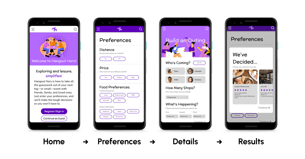 What we believe ultimately caused the most confusion was not making the destination(s) clear before asking a user for preferences on said location(s). Our initial user flow focused on logging preferences first without considering the number of group members or the desired locations. We adjusted the user flow to have our Details page come before Preferences instead. This way, the users could decide the destination(s) first, and then choose preferences relevant to their objectives for the outing.