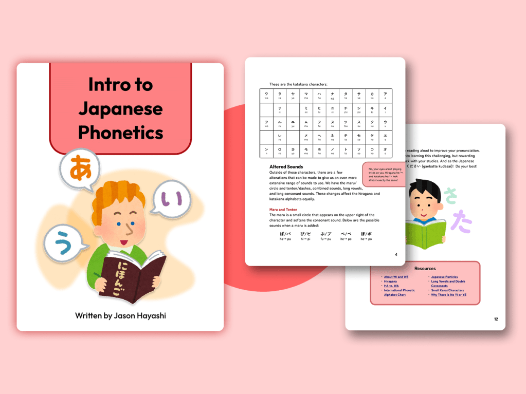 I wanted to provide some English words to help beginners understand the five major vowel sounds. I also made sure to explain how the “alphabet” in Japanese works differently than the English one by explaining that many of the characters are consonant-vowel pairs. Providing the hiragana and katakana alphabets allows beginners to not only practice making the sounds, but serves as a visual reference so beginners can learn to recognize and read these sounds.